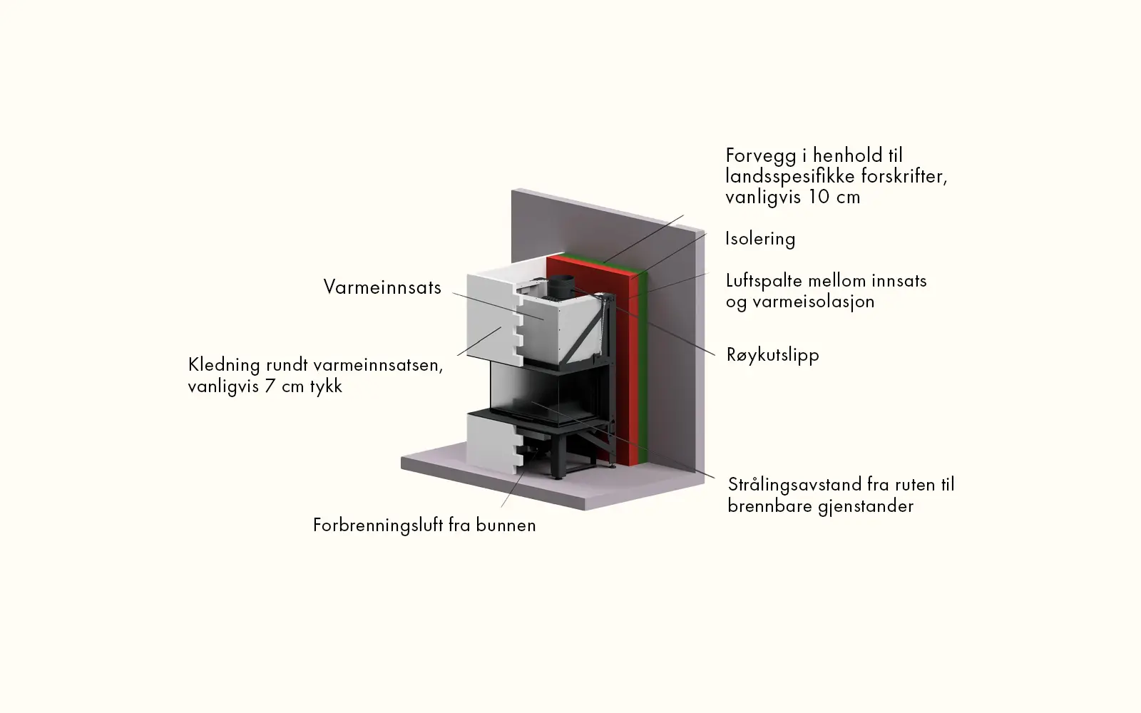 I oversikten nedenfor viser vi noen av de elementene man må passe på når man planlegger en peismontering. Det gjelder både tegning av nye boliger, eller når du skal montere en peis i din eksisterende bolig.